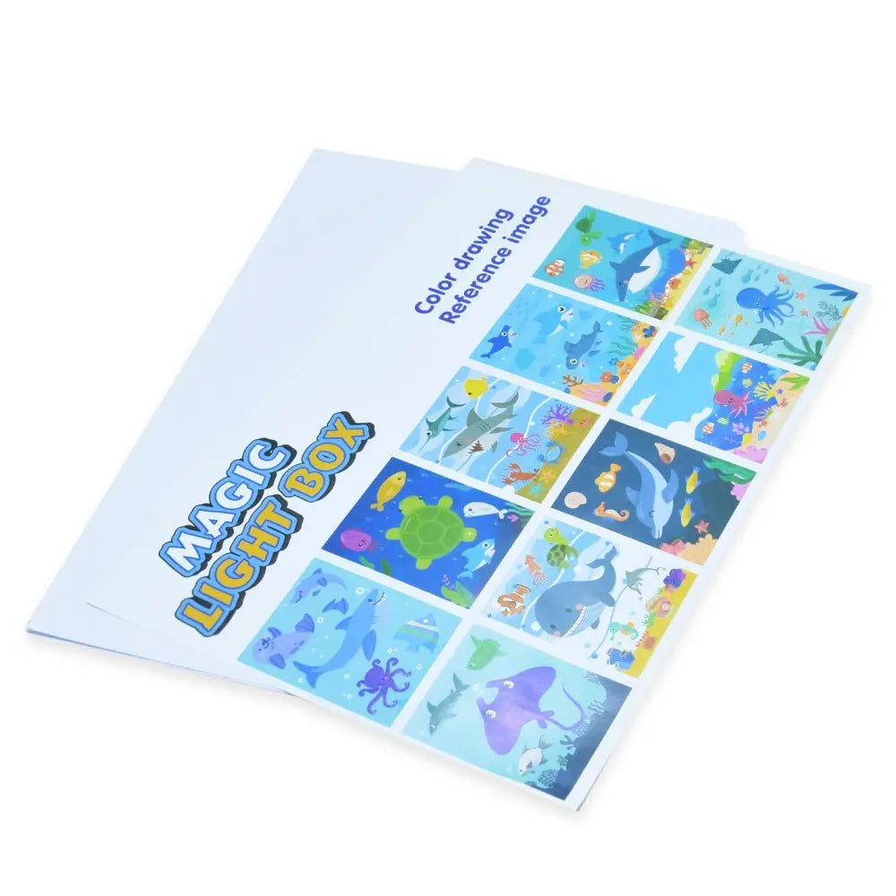 10 Hojas de Plantillas "Stealth Draw" (Dibujo Secreto): Con adorables diseños del océano (tortugas, peces, pulpos, etc.) que se revelan con la luz.