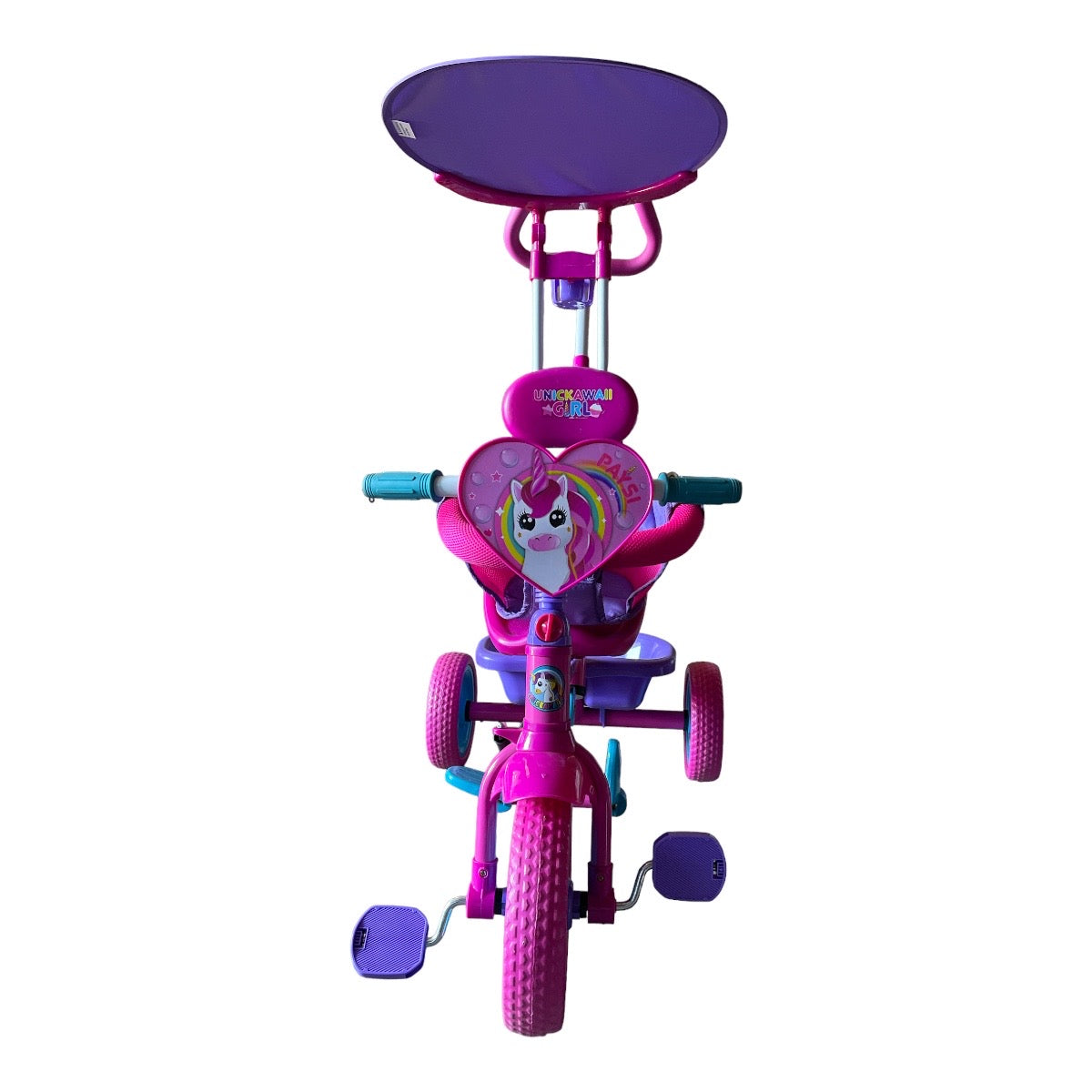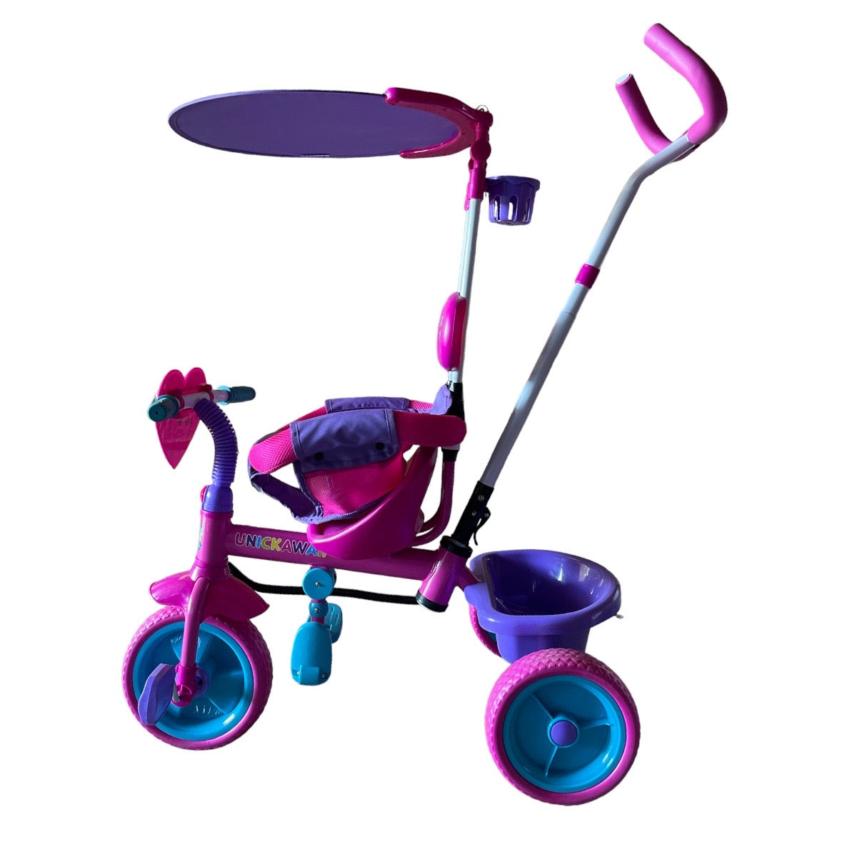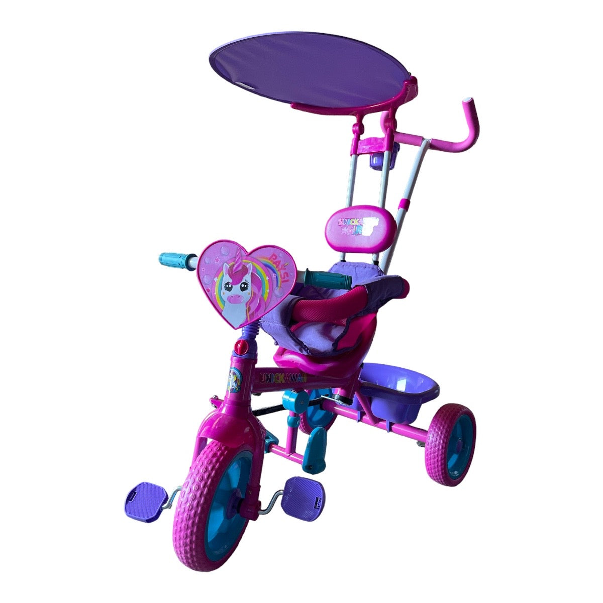 Recomendado para niños a partir de los 2 años de edad, el Triciclo con Toldo Unickawaii Rosado es el compañero perfecto para que tu pequeña explore el mundo que la rodea de forma segura y llena de diversión.